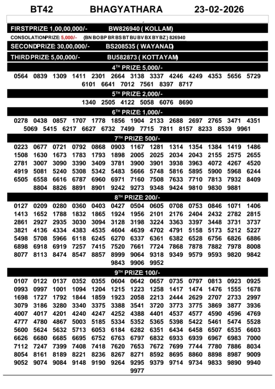 Kerala Lottery Result Today – Bhagyathara BT-43 | 23-02-2026