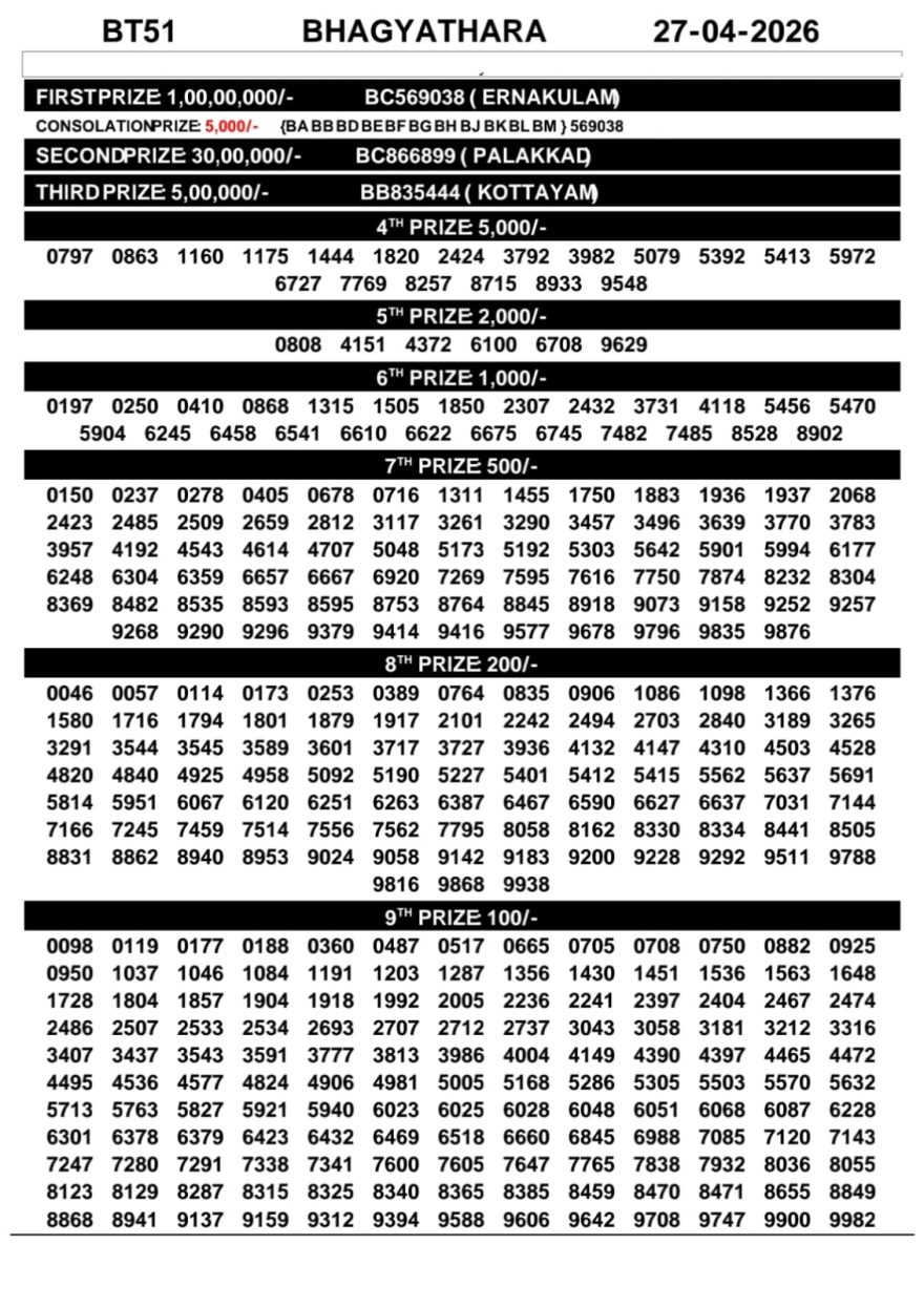 Kerala Lottery Result Today – Bhagyathara BT-52 | 27-04-2026