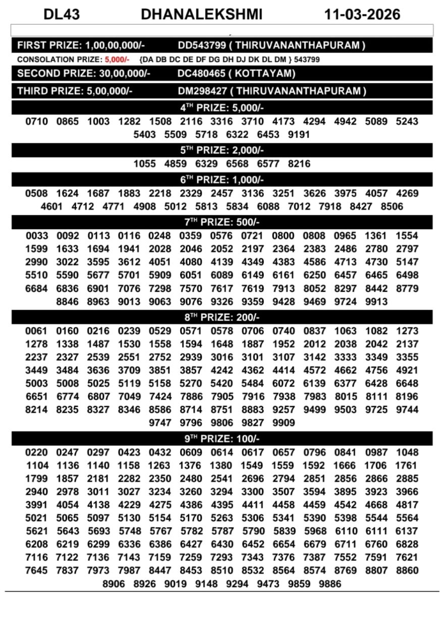 Kerala Lottery Result Today – DhanaLekshmi DL-43 | 11-03-2026