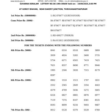 Kerala Lottery SUVARNA KERALAM SK 19 Result 19.09.2025