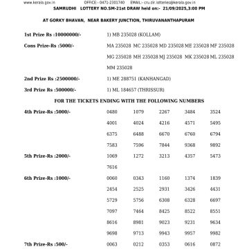 Kerala Lottery SAMRUDHI SM 21 Result 21.09.2025