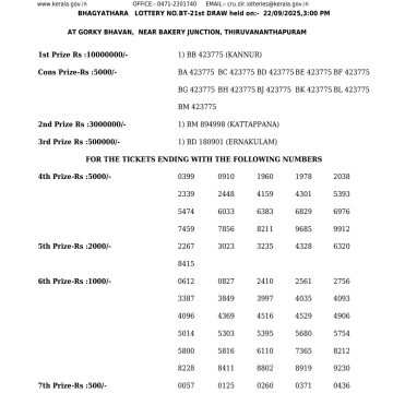 Kerala Lottery BHAGYATHARA BT 21 Result 22.09.2025