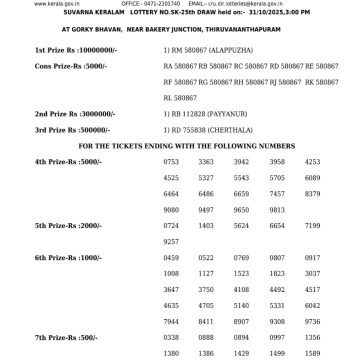 Kerala Lottery Result | Suvarna Keralam SK-25 Today (31.10.2025) Thiruvananthapuram: The Kerala Lottery Result for the Suvarna…